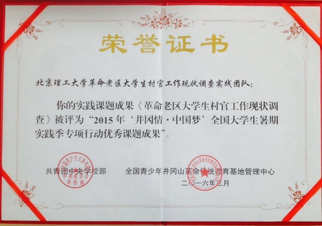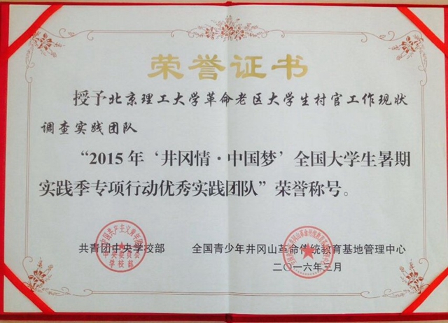 北理工实践团荣获2015“井冈情·中国梦”全国大学生暑期实践季优秀课题成果奖和优秀实践团队称号