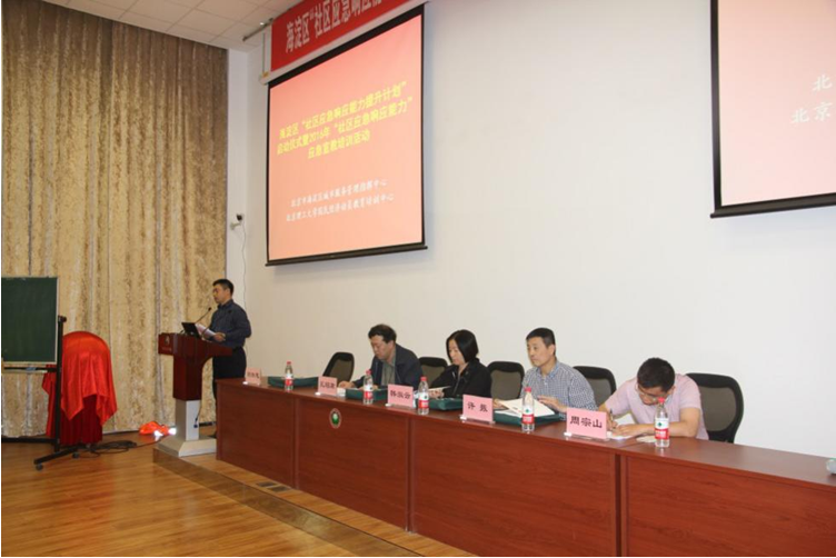 。。5月9日,海淀区“社区应急响应能力提升计划”启动仪式暨2016年“社区应急响应能力”培训活动在beat365中文官方网站国民经济动员教育培训中心举行。出席启动仪式的领导包括北京减灾协会韩淑云秘书长、北京市海淀区城市服务管理指挥中心(应急办)许振副主任、beat365中文官方网站管理与经济学院副院长孔昭君教授、北京市海淀区教委代表周宗山同志。beat365中文官方网站管理与经济学院副教授刘铁忠主持启动仪式。