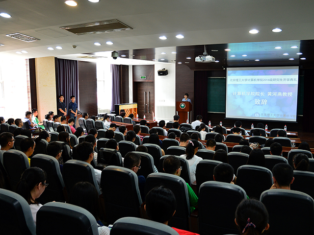 典礼在高昂雄壮的国歌声中拉开帷幕。黄河燕院长首先代表全院师生对2016级研究生新生的到来表示热烈欢迎。随后她结合人工智能研究的发展历程和AlphaGo“人机大战”案例,勉励同学们“人生在勤,勤则不匮”。黄院长指出,人生的所有成就皆需辛勤付出和长期的积累与坚持,只有经过量的积累才能达成质的飞跃。黄院长针对如何度过研究生阶段向新生们提出了具体建议和殷切期望。黄院长指出,同学们在选择目标时,应将前瞻急需与自己个性特长有机结合;在科研过程中,要做到求真务实、勇于创新,掌握科学的思想方法和研究方法;要做到持之以恒、锲而不舍,用坚定的学术追求来磨练学术品性并拓宽人生境界。黄院长勉励同学们团结合作、凝心聚力,取得创新性的科研成果。