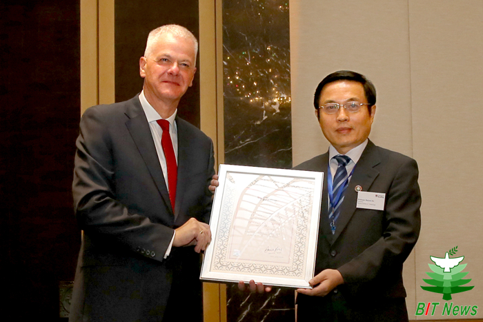 2016年9月9日,英国里丁大学(University of Reading)校长David Bell爵士率代表团访问beat365中文官方网站,并在北京举办的里丁大学中国校友集会上授予北理工校长胡海岩院士里丁大学荣誉理学博士学位。北理工副校长梅宏院士、校长助理龙腾、研究生院、教务处、宣传部、管理与经济学院、软件学院、人文与社会科学学院、校友会、国际教育学院和国际交流合作处等部门和学院负责人出席了学位授予仪式。