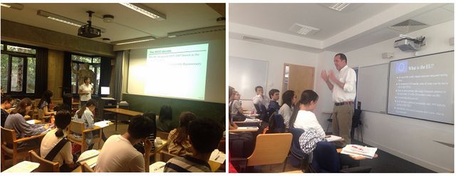 此次暑期项目学习的主要专业内容为《宏观经济学》课程,该课程由剑桥大学国王学院的老师Dr.Elisa Fariglia及Dr.Chryssi Giannitsarou分别为同学们讲授。其讲授内容与国王学院同年级经济系学生学习的内容相同。英国大学的本科是三年制,而作为世界一流大学的剑桥大学,其课程的内容量、相对难度和考核的严格都是众所周知的。同学们在最初上课时感到有些吃力,或对一些专业名词、理论基础不熟悉,或英语听力有困难。随后,同学们调整学习方法,利用课余时间提前预习课程,并成立了学习小组,相互交流,互相协作。在学习过程中,老师鼓励学生根据自己的情况随时提出问题,并在课堂上和同学们一起讨论,及时理清思路,增强学习效果。同学们也纷纷打消了自己在异国学习的紧张感,珍惜短暂而宝贵的机会,积极投身于课堂之中,主动参与课堂互动。除了专业课程以外,暑期项目安排了剑桥大学教授的学术专题讲座,包括“英国脱欧”、“人民币国际化”等诸多有特色的专题。讲座上学生们在聆听教授们智慧演讲的同时,领悟到了学术研究的方法和学术的真正魅力。