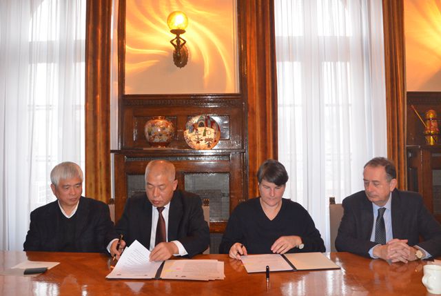 12月19日,李和章率团访问塞尔维亚贝尔格莱德大学,会见中国驻塞尔维亚共和国大使馆一等秘书陈永宁博士、贝尔格莱德大学校长Vladimir Bumbasirevic、国际交流合作事务副校长Ivanka Popovic,并代表学校签署了校际学生交换协议。代表团成员与贝尔格莱德大学相关学院负责人讨论了近期计划开展学生交换项目和联合培养的学科领域以及工作计划。贝尔格莱德大学化学学院院长Ivan Grzetic,技术和冶金学院院长Dorde Janaćković,电气工程学院院长Zoran Jovanovic参加会谈。
