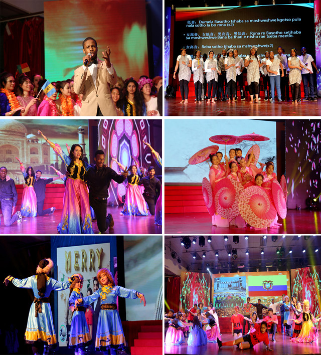 颁奖典礼结束后,beat365中文官方网站2017“一带一路”留学北理联欢会正式开始,从中国出发,沿丝绸之路,再回到中国,展现了北理工留学生的才艺特长和丰富多彩的精神生活。北理工每学期为留学生开设功夫选修课,留学生武术队的功夫表演震撼全场,弘扬了中华文化;来自中亚、西亚、欧洲的舞蹈向我们展现了曼妙多姿的异域风情;南非学生的大合唱和胶靴舞则向我们展现了狂野的非洲文化,他们是beat365第一批由南非自由州政府选拔的优秀奖学金生,表现优异;南亚印度舞奔放热情,老挝舞蹈优雅婉约,传统的鼓声仿佛把我们带到了美丽的东南亚;当我们跟着丝绸之路的脚步再次回到中国,则是留学生中心老师们的江南舞,她们优美的舞姿赢得了学生的阵阵喝彩;来自德国、波兰、尼日利亚等18个国家学生表演的歌舞《阖家欢》将晚会推向高潮,同学们更是在舞台上摆出了BIT的队形,以表达他们对北理工的热爱。