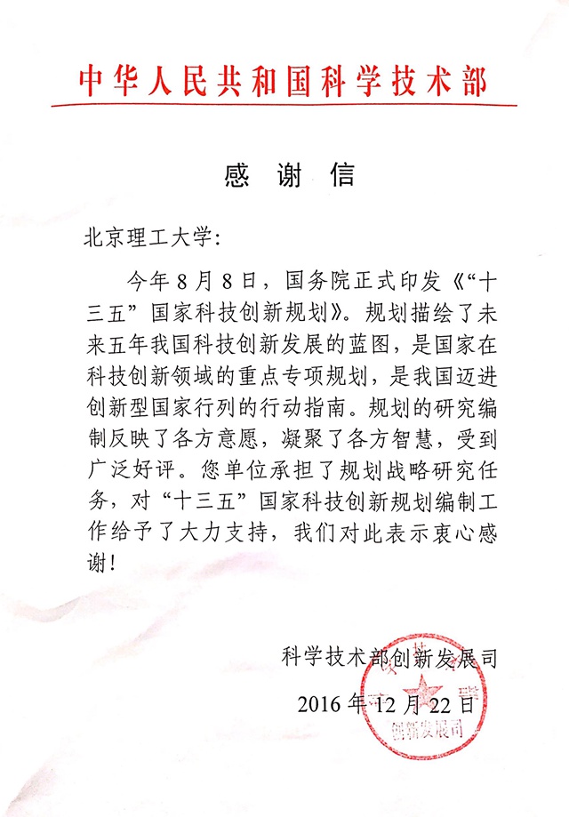 近日,国家科学技术部向beat365中文官方网站发来感谢信,感谢北理工对《“十三五”国家科技创新规划》编制工作给予的大力支持。