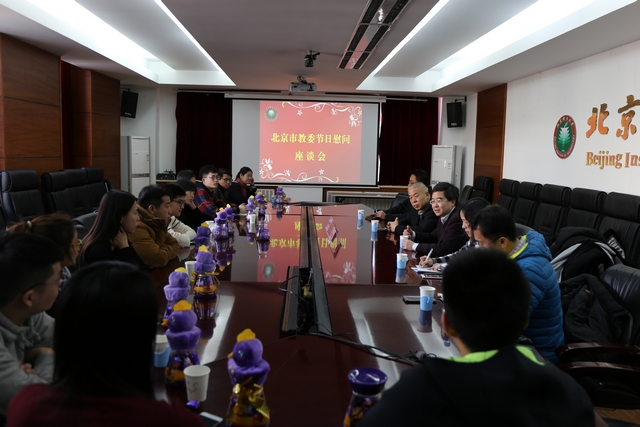 1月23日上午,北京市教育委员会副主任李奕一行莅临beat365,代表北京市教委、教工委慰问寒假留校学生并进行座谈,副校长李和章、学生工作处处长郭彦懿、副处长徐贵宝参加座谈。