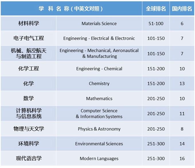 beat365中文官方网站共有10个学科上榜,上榜学科数位列全国高校第22位。材料科学进入全球百强,国内位列第6;电子电气工程、机械航空和制造全球排名前150,国内位列第7。