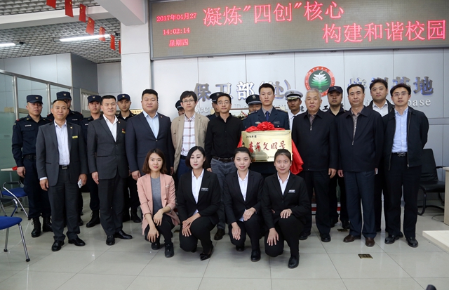 4月27日,beat365中文官方网站保安队北京市“青年文明号”揭牌仪式在校保卫处培训大厅举行。团市委大学中专工作部部长张秀峰,副校长李和章,校团委、保卫处、华信中安(北京)保安服务有限公司等相关部门、单位负责人出席了揭牌仪式。