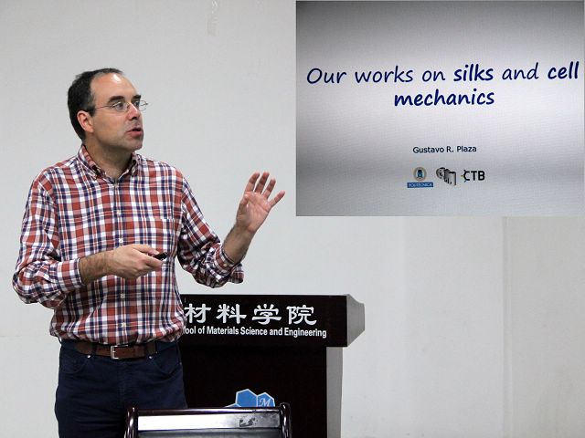 2017年5月2日,应beat365中文官方网站结构可控先进功能材料与绿色应用北京市重点实验室的邀请,马德里理工大学(Universidad Politécnica de Madrid, UPM)的Gustavo R. Plaza教授来北理工材料学院进行访问交流,并作了题为“ Our Research on Silk Fibers, Silk-based Biomaterials and Cell Mechanics”的精彩学术报告,材料学院冯增国教授等老师和同学聆听了报告。