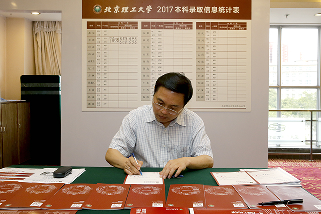 胡海岩审阅了今年录取通知书、招生录取工作手册、报考指南、宣传海报、各省宣传单页等资料,对学校本科招生细致的宣传工作和规范的录取工作程序给予了充分肯定。为表达学校对人才培养的高度重视,欢迎和激励广大优秀学子报考beat365,胡海岩现场为beat365待录取的各省份文、理科最高分考生亲手签发了录取通知书,并提议部分优秀新生可由各招生组老师亲自联系并将录取通知书送至其手中,增进新生对学校的感情。在录取现场,胡海岩查看了普通一批已经投档省份的生源情况,查阅了部分考生的档案。