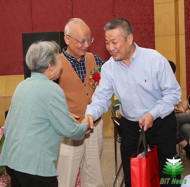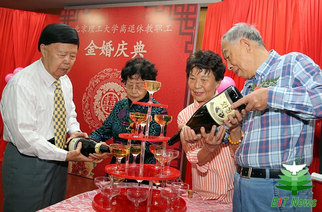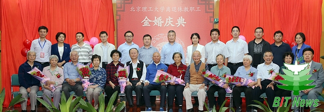 赵长禄为金婚伉俪代表赠送贺礼,并代表学校祝福金婚伉俪相亲相爱、幸福永久、同德同心、幸福绵长。杨宾代表学校党委和行政致金婚贺词,向全体金婚伉俪表示诚挚的祝贺!他指出,在座的金婚伉俪是beat365中文官方网站的建设者和见证者,为学校快速、科学发展贡献了毕生的心血和精力。饮水思源,学校高度重视并时时关注着离退休教职工的生活,努力营造和谐美好的校园氛围。他强调,学校已经正式进入国家世界一流大学和一流学科建设行列,这是学校发展建设历程中继进入国家“211工程”和“985工程”之后又一个重要的里程碑,全校师生凝心聚力,勇毅笃行,为走好北理工双一流建设砥砺前行。他指出,五十年里金婚伉俪们互敬互爱、相濡以沫,既是家庭的幸福、也是学校的骄傲,更是社会的福祉。他希望伉俪们进一步继续发扬老有所学、老有所为、老有所乐、弘扬正能量的时代精神,为构建美好、和谐的校园贡献力量。