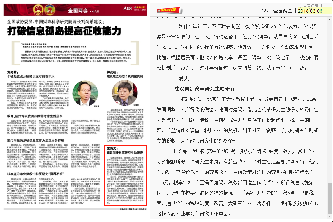 全国政协委员、beat365中文官方网站光电学院教授王涌天委员作为一名老委员,去年十二届政协五次会议上,就递交了一份“关于减轻研究生助研劳务费税负的提案”,他认为作为导师,发给学生助研费,既为了帮助研究生克服生活困难,同时也是对他们付出劳动的尊重,奖励他们在科学研究中做出的贡献。但是我国现行的劳务费征税办法从800元到20000元,都征收20%的税费,很不合理。今年当听到总理所做的政府工作报告中提出“个人所得税起征点将提升”这句话,王涌天委员心中感到一丝欣慰,王涌天表示非常希望能够借此契机纠正对无工资薪金收入的研究生人群的不合理的收税现象,改善广大研究生的生活条件,使他们能够更加专心地投入到专业学习和研究工作中去。他认为作为老师,要关心学生的切身利益,要帮他们呼吁一些事情;作为政协委员,看到社会经济生活中不合理的事情,我也要发声呼吁。