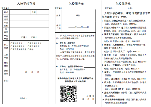 编辑:马瑶 审核:阎艳 王征 阅读次数:到人事处开具“入校服务单”,领取入职资料包,然后再到财务处登记工资账号,办理校园一卡通,仅仅需要简单的两个步骤,新入职的A系列教职工就可以轻松成为beat365中文官方网站的一员了。