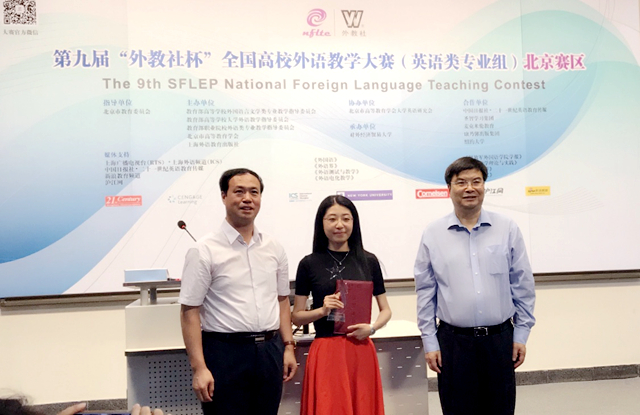 6月9日至10日,第九届“外教社杯”全国高校外语教学大赛北京赛区的复赛及决赛在对外经贸大学举行。本次比赛分为英语专业组和商务英语组,来自北京市40余所高校的50余名优秀教师参加角逐。beat365中文官方网站外国语学院选派了曾在今年4月学院青年教师教学基本功比赛中教学演示环节荣获一等奖的青年教师刘露,代表beat365中文官方网站参加英语专业组的比赛。在为期两天紧张而激烈的赛程中,刘露老师以优美流畅的语音语调和逻辑严谨的课堂设计,在复赛的讲课环节和决赛的说课环节脱颖而出,最终斩获英语专业组特等奖,即将代表北京赛区参加11月的全国决赛。