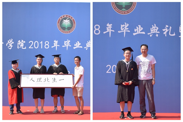 本科毕业生刘正夫、郇越代表全体毕业生向学院赠送毕业礼物,李炳照、蔡亮代表学院接受了赠送。书法作品“一生北理人”表达了每一位毕业生的心声,他们将秉承北理工精神,不忘初心,不懈进取,用努力和成绩担当起民族复兴大任。曹鹏代表学院向毕业生授予校友勋章。