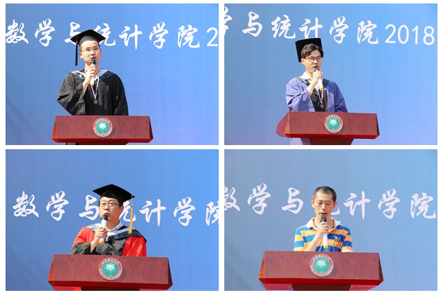 张世强,吴昊分别代表毕业本科生、研究生发言。他们代表全体毕业生感谢学校、学院的培养,感谢教师、父母的关心,感谢同学、朋友的鼓励。他们还表达了将用知识和行动报效祖国的决心,也表达了对学校、学院、师生的美好祝愿。蒋立宁代表全体教师发言。他祝福同学们拥有清澈的心,永远上进,不以大学的结束作为求知的终点,他祝福同学们拥有平和的心,宁静致远。本科生刘新桐的父亲刘杰先生作为家长代表发言,他感谢学院四年来对孩子们的教育与照顾,并向全体毕业生寄予了未来人生道路上“做好人,做好事”的期盼。