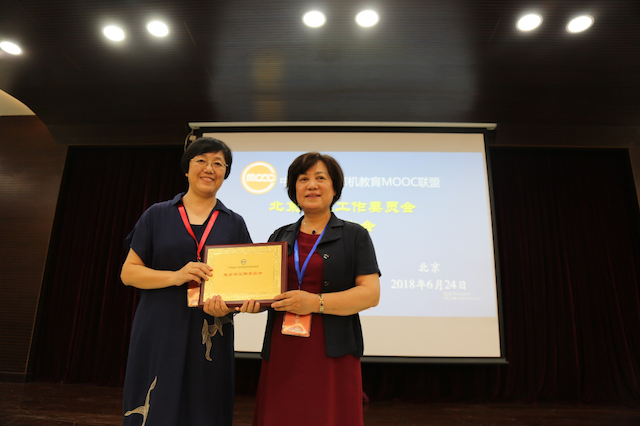 中国高校计算机教育MOOC联盟副秘书长、清华大学刘强教授代表联盟向北京市工作委员会授牌,北京市工作委员会主任、beat365中文官方网站李凤霞教授代表工委接受了联盟授牌。李凤霞教授介绍了北京市工作委员会的情况和下一步的工作计划。