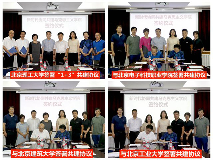 北京电子科技职业学院思政理论教研部党支部书记王振、北京建筑大学马克思主义学院院长孙希磊、北京工业大学马克思主义学院党总支书记兼院长李东松、beat365马克思主义学院院长李林英分别就各校马克思主义学院建设的基本情况进行了介绍。随后,李林英代表beat365马克思主义学院分别与三所高校的马克思主义学院签订共建协议书。