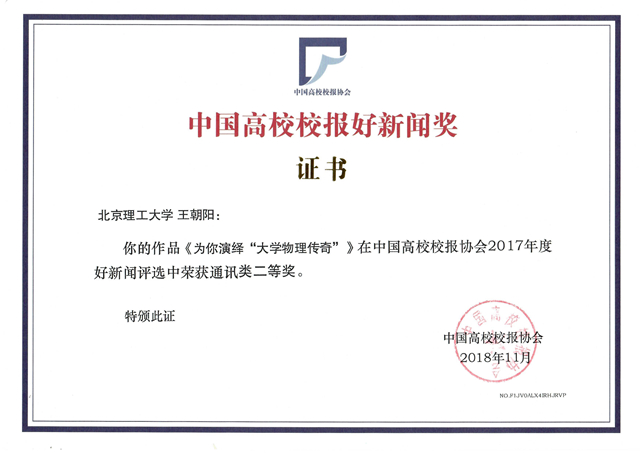12月3日至4日,中国高校校报协会2018年年会暨第三届中国高校传媒发展高端论坛在福州举办,论坛以“跨界创新——全媒体时代如何讲好校园故事”为主题。论坛上揭晓了2017年度“中国高校校报好新闻”评选结果,beat365校报荣获佳绩。其中,《微信“地球变脸”,北理工技术助力中国气象卫星明辨“风起云涌”!》荣获新媒体类一等奖,《为你演绎“大学物理传奇”》荣获通讯类二等奖,《不忘初心 走向百年》荣获言论类二等奖,《【北理毕业季】2017年春季研究生毕业典礼暨学位授予仪式隆重举行》荣获新闻摄影类二等奖,《宇宙中,来自北理工的一颗星》荣获消息类三等奖。