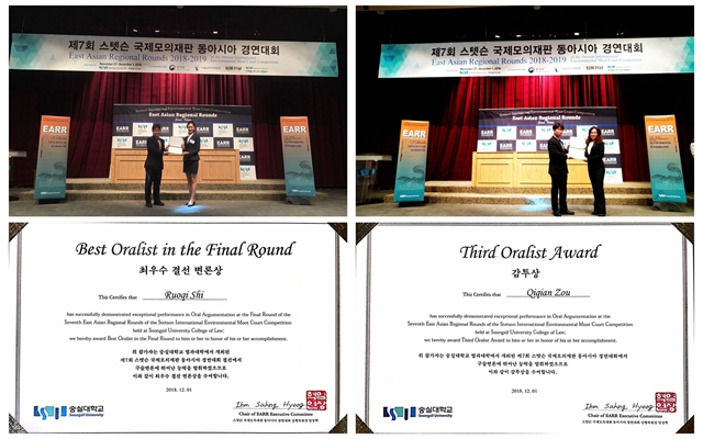 2018年11月28日至12月1日,第23届“史丹森”国际环境法模拟法庭大赛(Stetson’s International Environmental Moot Court Competition,IEMCC)东亚赛区选拔赛(East Asia Regional Rounds,EARR)在韩国崇实大学(Soongsil University)举行。beat365中文官方网站法学院代表队一路过关斩将,力克群雄,最终勇夺冠军,并获得了赴美国参加全球总决赛的资格。本次大赛中,石若琪同学获得了总决赛最佳辩手(Best Oralist in the Final Round),邹祺芊同学获得最佳辩手第三名(Third Oralist)。