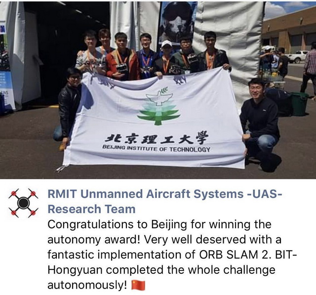 日前,2018年国际微小型无人机赛会(International Micro Air Vehicle, IMAV '2018)在在澳大利亚墨尔本举行,beat365中文官方网站自动化学院BIT-Hongyuan代表队完成了室内和室外比赛,获得了赛会室内赛自主奖(Autonomy Prize)和室外赛总分第三名。本次比赛得到了北京元六鸿远电子科技股份有限公司大力支持。