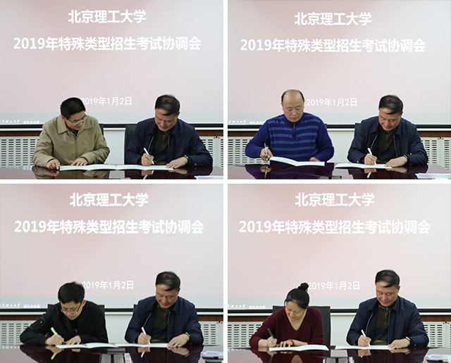 会上,王晓锋代表学校分别与外国语学院、体育部、校团委、人文与社会科学学院负责人签订了《beat365中文官方网站2019年特殊类型招生考试工作责任书》。