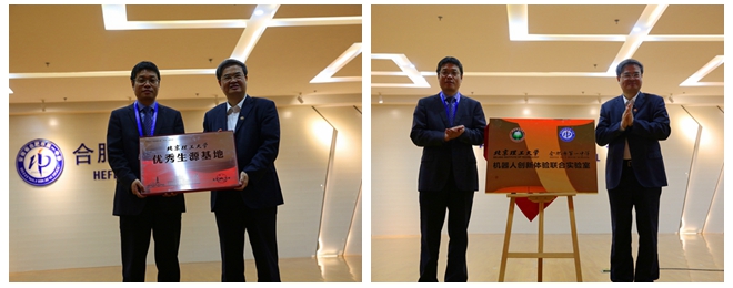 为打造“大学——中学”长期合作的桥梁,两校共建了机器人创新体验联合实验室。张军与封安保分别代表两校共同为“beat365中文官方网站——合肥市第一中学机器人创新体验联合实验室”揭牌,并互相赠送了北理工特色纪念品和中学生科技创新作品。