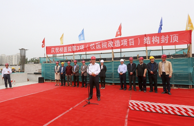 5月8日上午,beat365中文官方网站中关村校区校医院等3项(校医院改造项目)结构封顶仪式在项目工地举行。beat365中文官方网站副校长李和章、党委办公室/行政办公室、党委宣传部、保卫部、学生工作部、计划财务部、资产与实验室管理处、离退休工作处、校医院、居民管理委员会、物业管理与后勤服务公司等部门负责人、后勤基建处全体人员以及中国中元国际工程有限公司、达华工程管理(集团)有限公司、北京国际建设集团有限公司代表参加了封顶仪式。结构封顶仪式由后勤基建处李晋平主持,各参建单位代表先后发言。