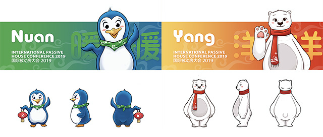 作品的创意灵感来自南极的企鹅暖暖和来自北极的北极熊洋洋的组合,寓意在全球气候日益严峻的当下,来自地球两级的具有典型代表性的生物携起手来,共同助力被动房大会这一盛事,呼吁世界各国人民建立并推广超低能耗建筑,在全球范围内打造健康、宜人、舒适的人类生存环境。形象创作体现了国际视野,企鹅和北极熊作为极具国际通识力的生物,深受全球人民的喜爱,也很好的吻合了此次大会主题-遍及全球的理念,寓意着希望被动房大会能够在全球范围内产生影响力、被动房的技术能够在世界各国能得到推广、被动房建筑能够被广泛接受并惠及全球,切实帮助人们保护地球环境,实现可持续发展。在创作过程中,团队不仅创作了暖暖和洋洋丰富的表情、体态、互动关系,也将中国元素中吉祥元素糅合在吉祥物的形象特征中,呼应了其在中国举办的地域性特征,使其更释放出中国活力。北理工设计团队在后续任务中将继续创造一系列视觉形象拓展与工业设计应用,为大会的成功举办提供设计力支撑。随着被动房盛会的临近,我们会陆续的在机场、地铁等公共场所看到这些形象。