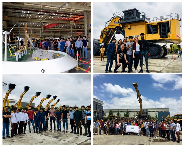 在挖掘机械事业部,同学们进入大吨位装载机智能化制造基地,自动化的流水生产线鳞次栉比,百余台智能焊接机器手正在进行结构焊接操作,通过电脑指令自动完成焊接,生产井然有序。公司车间外的广场上,徐工自主生产的上百台挖掘机械产品有序排列,其中有着“神州第一挖”之称的我国最大吨位挖掘机——总重700吨的液压矿用挖掘机,瞬间吸引了所有人的目光。这台身长近24米、高度超过10米、铲斗宽5米的庞然大物于2018年4月精彩亮相,标志着中国成为继德国、日本、美国后第四个具备700吨级以上液压挖掘机研发制造能力的国家,让国人自豪、令世界赞叹。此外,同学们还观看了被习近平总书记誉为“钢铁螳螂”的步履式挖掘机的现场操作表演,这台由徐工自主研发的设备是中国工程机械装备“智”造的典范,动作灵活稳健,其炫丽灵动的表演令人惊叹不已。