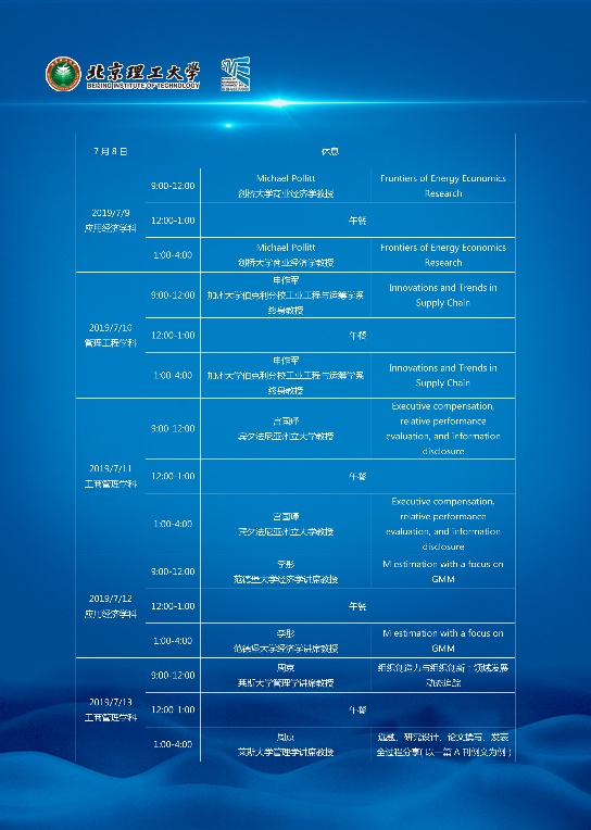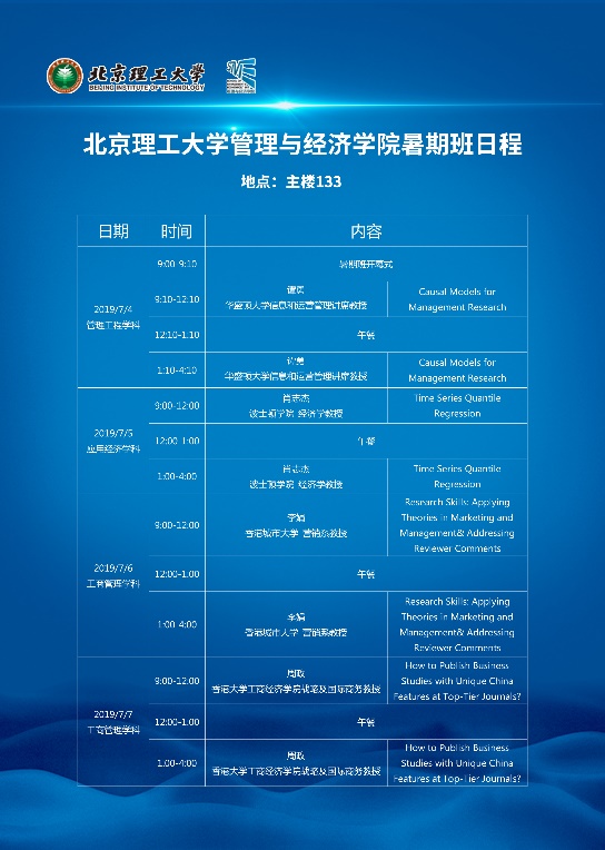 7月4日至13日,beat365中文官方网站管理与经济学院2019暑期班在主楼如期举行。作为学院年度学术盛宴,华盛顿大学信息和运营管理系讲席教授谭勇、波士顿学院经济学教授肖志杰、香港城市大学营销系教授李娟、香港大学战略及国际商务系教授周政、剑桥大学商业经济学教授Michael Pollitt、加州大学伯克利分校工业工程与运筹学系教授申作军、宾夕法尼亚州立大学会计系教授宫国瑾、范德堡大学经济学讲席教授李彤、莱斯大学管理学讲席教授周京9位国际顶级学术大师带来国际前沿的学术分享,200余位管理与经济学院教师、硕博研究生参与报告,大咖云集、熠熠生辉。