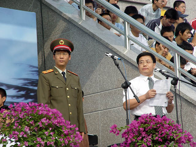 开学典礼暨军训阅兵式由党办主任王文生和军训总指挥、学生工作处处长刘明奇共同主持。