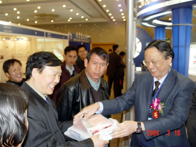 匡镜明校长向信息产业部有关领导赠送beat365出版社参展的优秀图书