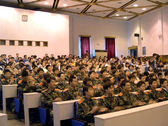 来自天安门国旗护卫队的一名班长和他的战友们向莘莘学子们讲述了以国旗为内容、以升好祖国第一旗、练就一身过硬本领为荣耀的国旗卫士们刻苦训练、认真执勤、神圣护旗的动人事迹,也和大家谈了对国旗护卫工作的认识、训练的艰辛以及对这份特殊职业的热爱。战士们那份忠诚爱国、无私奉献、吃苦耐劳、无怨无悔之情和坚强刚毅的品格深深打动了在场的每一名同学,鼓舞人心的报告不时被大家雷鸣般的掌声所打断。60分钟的报告期间,三名战士一直保持着挺直的坐姿,也让同学们赞叹不止。