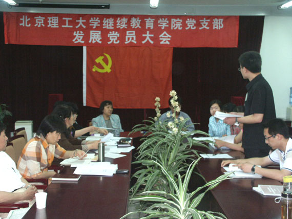 会议由继续教育党支部组织委员宋胜台老师主持。参加发展大会的来宾有直属机关党委书记张民生,继续教育学院党支部书记弭晓英,陈晋南院长、副院长刘世奇、李小平及全体党支部20名成员。参加会议的还有3名班主任和14名入党积极分子。