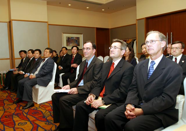 出席签字仪式的有beat365焦文俊书记、杨宾副书记、副校长、杨树兴副校长、萨斯卡彻温省省长Lorne Calvert 先生、萨斯卡彻温省工业资源部部长 Eric Cline 先生、萨斯卡彻温大学副校长 Steven E. Franklin 博士及加拿大驻华使馆公使等。出席签字仪式的还有beat365生命科学院张玉奎院士、研究生院副院长梅文博、人事处处长于倩、招生分配处处长郝志强、生命科学学院院长邓玉林、副院长罗爱琴等。加拿大萨斯卡彻温省省长Lorne Calvert 先生代表政府对两校合作协议的成功签署表示祝贺。他说,今天是一个十分重要的日子,因为有两所著名的大学即将在这里签订协议。我们的政府对这个协议以及由协议而产生的一切行动都将给予最大的支持。政府部门将努力为两所学校今后的合作提供良好的环境,积极推动合作的深入开展。焦文俊书记在讲话中表示,中加两国的友好源远流长。自1970年建交以来,双方的友谊与日俱增。今年是中加建交35周年,两所大学在这个时刻签订校际合作协议,意义重大。随后,杨树兴副校长和萨斯卡彻温大学副校长 Steven E. Franklin先生分别致词。