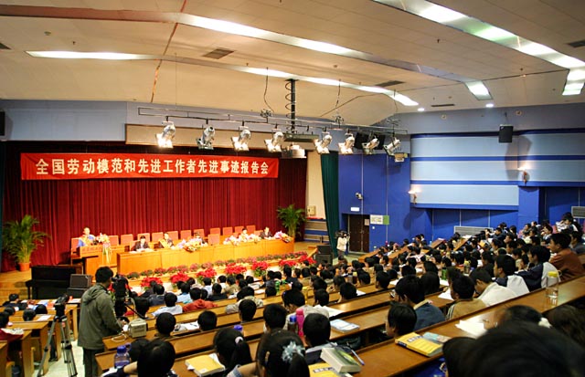11月8日下午,中心教学楼一层报告厅不时响起雷鸣般的掌声。由中宣部组织的全国劳动模范和先进工作者先进事迹报告会正在这里举行。全国劳动模范、青岛港集团前湾集装箱码头有限责任公司桥吊队队长许振超,全国劳动模范、四川省木里藏族自治县邮政局邮递员王顺友,全国先进工作者、山西省荣军医院护士长郝颂琴,全国先进工作者、云南省保山市公安局副局长明正彬,为beat365师生讲述了自己爱岗敬业、无私奉献的劳模精神。