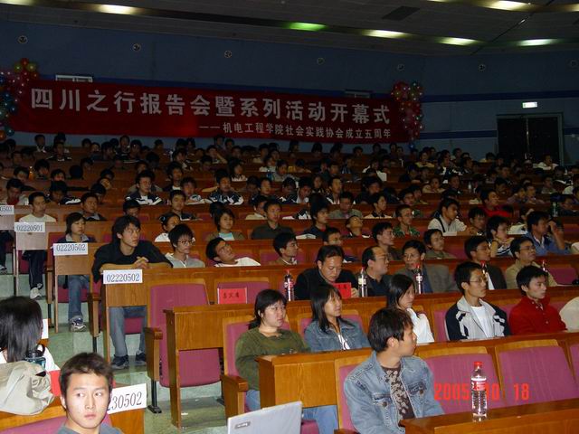 机电工程学院社会实践协会自2001年成立以来,至今已经走过整整五个春秋。今年10月至11月期间,机电工程学院分团委主办了社会实践协会成立五周年庆典系列活动。上图为五周年庆典开幕式暨2005年“四川之行”暑期社会实践成果报告会活动现场。