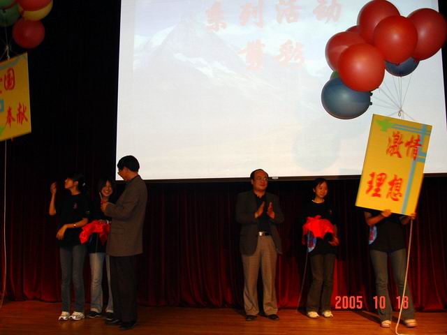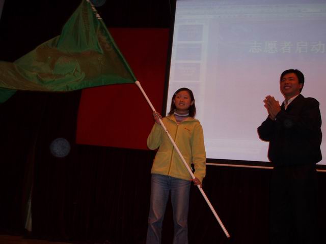 校团委书记张启鸿老师为志愿者代表授旗,它标志着我院2005至2006年度志愿者服务工作全面启动!全体志愿者跟随领誓人一起宣誓!“如果说志愿者是一滴水,我们相信,我们同样可以折射出七彩的光芒!......” 志愿者的感言句句发自内心,感人至深。接下来举行了文化衫设计大赛颁奖仪式,现场揭晓了获得一、二、三等奖的作品,获奖者上台向大家解说他们的设计立意,随后由校团委张书记和我院董老师为获奖同学颁奖。