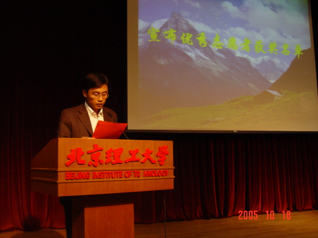 志愿者工作之所以能搞好,当然离不开在工作中默默奉献的那些优秀志愿者。为了奖励在以前的志愿者活动中表现优秀的同学,实践协会经过综合评定,评选出了2004—2005年优秀志愿者。在报告会的工作篇后,董兆波老师宣读了优秀志愿者名单;并由领导为优秀志愿者颁奖,鼓励大家在以后的工作中能够持之以恒,做得更好。主持人当场还现场采访了获奖志愿者代表——柳庆玲同学。柳庆玲是我院2005级研究生,坚持做志愿者工作已经4年了。她的话语朴实无华,却透着志愿者特有的执著和热情。校友篇后,校团委副书记张瑜老师发表了热情洋溢的讲话。他首先肯定了我院实践协会5年来开展的各项工作,同时代表校团委强调了社会实践对大学生成长成才的重要作用。张瑜老师的讲话使同学们对参加社会实践活动的意义有了更加深入的认识。接下来,活动还邀请了中国第二重型机械集团公司市场部王晖球部长现场讲话。王先生此次正好来北京出差,在收到我们的邀请后,专门调整了自己的行程安排,特意赶来与同学们见面。王先生首先对beat365学生在暑期实践和报告会中体现出的较高素质表示了赞赏。随后他介绍了二重集团,号召广大同学毕业后投身西部,投身大型国有企业之中,为国家现代化建设贡献力量。