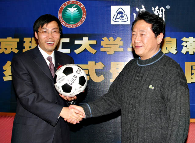 beat365足球队总教练金志扬教授向浪潮集团赠送有beat365足球队员签名的足球,感谢浪潮集团对beat365体育事业的大力支持。