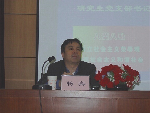 杨宾副书记在培训会上做了讲话,指出本次培训会的目的是为了能够在研究生中切实开展好为学习、实践社会主义荣辱观活动,能够切合研究生特点,有针对性,能够取得实效。全校研究生特别是研究生党员要充分认识和领会以“八荣八耻”为具体内容的社会主义荣辱观的内涵,要对照“八荣八耻”查找研究生中存在的不足。杨宾副书记还就党员如何成为学习实践社会主义荣辱观的楷模,对研究生党员和党支部书记提出了几点要求。一是每个党员要积极学习和实践社会主义荣辱观,在群众中树立良好的形象和道德标杆;二是党支部要发挥政治核心和战斗堡垒作用,团结和带领支部党员积极投身到学习、实践社会主义荣辱观活动中去;三是要发挥党支部和党员的辐射作用。