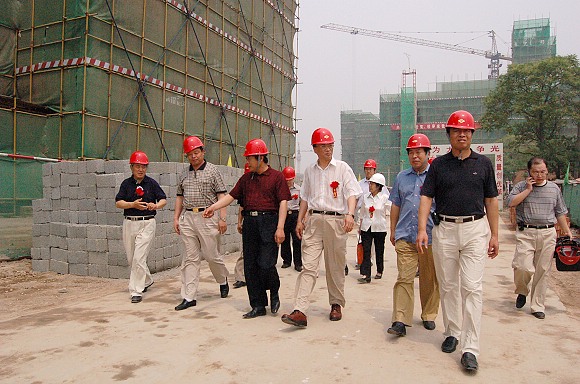 党委副书记、副校长杨宾和副校长李和章在观看学生宿舍楼群封顶过程。