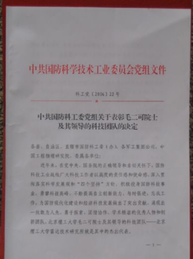 当前,国防科技工业已进入新的发展阶段,建设创新型国防科技工业、加快推进转型升级战略、实现跨越式发展的任务繁重而艰巨。为适应新的形势和任务的需要,进一步加强国防科技高层次人才队伍建设,动员和激励广大科技工作者和全行业干部职工,抓住机遇,迎接挑战,大力实施科教兴国合人才兴业战略,在庆祝建党85周年之际,国防科工委党组决定,对为国防科技事业做出突出贡献和显著成绩的毛二可院士及其领导的科技团队进行表彰,并授予该团队“国防科技工业优秀科技创新团队”称号。