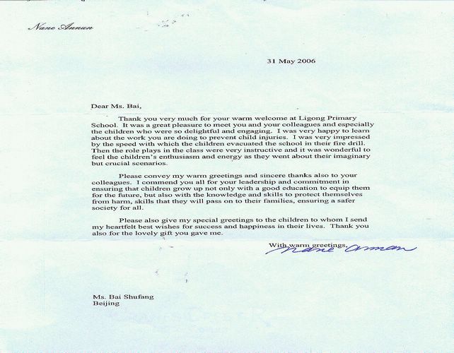 2006年5月22日下午,联合国秘书长安南的夫人在中国常驻联合国代表团王光亚大使的夫人丛军大使的陪同下访问了beat365中文官方网站,参观了beat365中文官方网站幼儿园和附属小学的联合国“预防儿童伤害”项目。近日,安南夫人专门向理工附小致信,表示自己由衷的感谢。