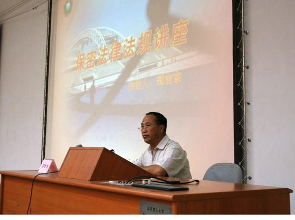 郭吉东向同学们介绍了《保密法》以及《保密法实施办法》的基本内容和结构,并对保密法的实施主体、国家秘密的定义、保密工作的方针、各类保密管理规定等必须掌握的保密法相关基本知识进行了重点讲解。他指出,随着国民经济的发展,当前保密工作面临着前所未有的挑战,保守国家秘密是包括大学生在内的全体公民应尽的义务,掌握一定的保密知识,也有助于同学们将来的学习和工作。郭吉东通报了北京市近期保密工作情况,强调院校要结合中央及市委领导的保密要求,结合上级的保密工作部署,结合个人具体的学习工作情况,抓好保密法律法规的学习和宣传。他还特别指出,在校大学生要有敌情意识和国防观念,把确保国家秘密的安全贯彻到行动中。