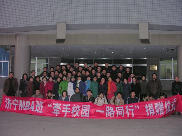 在捐助仪式上,MBA2006济宁班班班党支部书记马辉详细介绍了第三批济宁MBA班“牵手校园,一路同行”的工作实施方案;学员代表王惠汇报了资金筹措情况和下步工作打算。受助学生代表在接受助学金和生活用品后深受感动和鼓舞,发言说:感谢来自各方面的帮助,一定不负众望,发奋努力,把这份温暖的爱和温情传递下去。