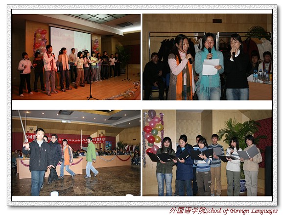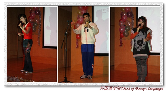 外国语学院副书记、副院长吴文君老师赞扬了此次忘年会准备的充分,希望老师同学们在辞旧迎新的时刻玩的开心尽兴,并祝愿同学们在新的一年中好好学习,天天向上。