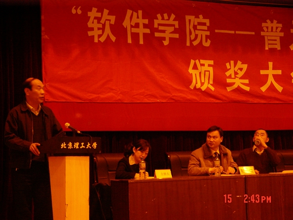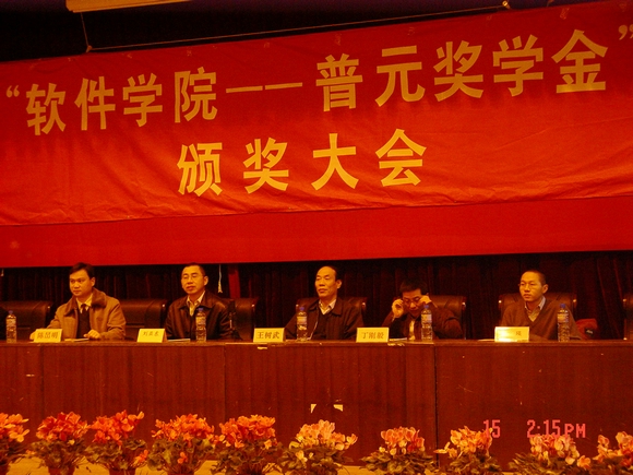 2007年1月15日下午14时,软件学院在7#教学楼报告厅成功举行了“软件学院——普元奖学金”颁奖大会。普元信息技术有限公司董事长、软件学院软件工程系主任刘亚东博士,普元信息技术有限公司董事长助理姚瑛先生,软件学院分党委书记王树武教授,软件学院副书记、副院长陈旵明老师,软件学院常务副院长丁刚毅教授及软件学院各系主任助理、办公室主任、软件工程系研究生《高级软件工程》课程指导教师、软件工程系全体2006级研究生参加了颁奖大会。