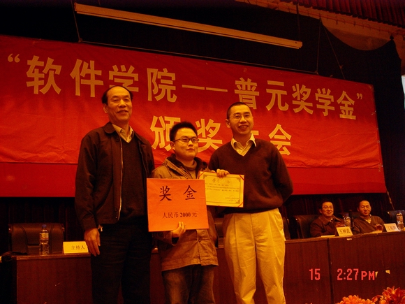此次2006/2007学年“软件学院——普元奖学金”设立了最佳项目一、二、三等奖和最佳组织奖、最佳答辩奖、最佳文档奖、最佳应用奖四个单项奖,共计人民币一万元的奖励。“软件工程系管理系统”、“采购中心管理系统”、“项目申报系统”等11个项目获得2006/2007学年“软件学院——普元奖学金”。刘光宗同学担任项目组长的“学生社团管理系统”项目,因小组内所有成员都参与了软件设计、开发和实施的全过程,软件功能齐全,缺陷数目较少,团队协作精神好而最终摘得2006/2007学年“软件学院——普元奖学金”最佳项目一等奖。普元信息技术有限公司董事长、软件学院软件工程系主任刘亚东博士和软件学院分党委书记王树武教授共同为2006/2007学年“软件学院——普元奖学金”最佳项目一等奖颁发了获奖证书和奖金。
