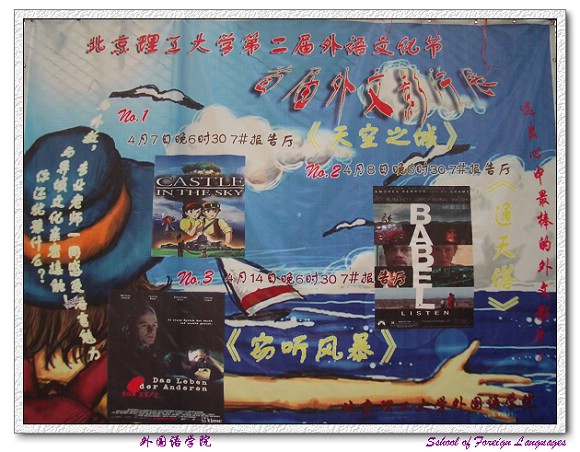 为营造学校外语学习氛围,用不同的形式促进学生学习外语的积极性,活跃校园文化,为创造和谐校园做贡献,外语文化节系列活动外文电影展评在近期举行。此次展评分三场,分别展映了不同语种,不同时代,不同风格的三部影片。